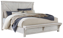Made with Acacia veneers and select hardwood solids and finished in a white textured rub-through finish. Modern craftsman touches with the thru-tenon look throughout and generous scaling of the cases and pilasters. Panel bed features planked faux barn door panels with accenting metal hardware. Cases feature framed and planked tops with raised center panel. Night stand features an AC power supply with (2) USB charging ports. Fully finished dovetailed drawer boxes with ball bearing side glides. Hardware is an industrial bar pull with square back plates with a brushed nickel color finish. The B740-154/-156/-157/-158 bed design features a cantilevered bench incorporated into the footboard and a cross-buck panel headboard.