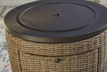 Warm up cool nights with this round fire pit table. Sporting an easy-on-the-eyes look inspired by driftwood, this fire pit table elevates the art of alfresco living. Its chic circular top is paired with all-weather resin wicker over rust-proof aluminum for beauty and brawn. A stainless steel burner with glass beads adds a captivating element sure to wow.