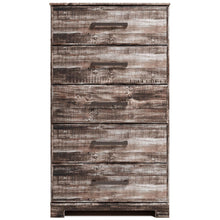 For those with a love of salvaged design elements, look no further than this chest of drawers. It's beautifully crafted to resemble heirloom furnishings using a weathered finish of rustic brown with a worn-through painted effect. Framed drawer fronts and large wrought-iron style hardware add dimension and authenticity. Five smooth-gliding drawers neatly accommodate your wardrobe needs.