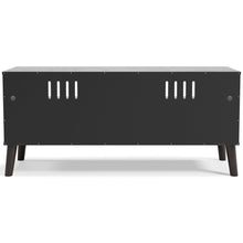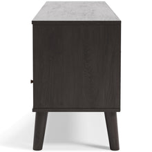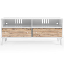 The perfect marriage of contemporary and casual style, this TV stand is a charming addition to your home. The entertainment center is expressive with its two-tone look in a dark charcoal finish and a replicated sugarberry wood grain pattern. The two smooth-gliding drawers and open shelving allow you to store electronic accessories with ease. Black knobs and splay legs add a finishing touch.