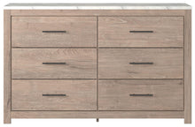 Cool, clean and casually modern. This dresser's light natural finish and faux Calcutta marble top set the tone for your calming sanctuary. Large linear pulls add dimension and authenticity. Six smooth-gliding drawers neatly accommodate your wardrobe needs.