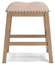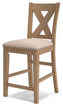 Show off your taste for charmingly curated style with this counter height bar stool. Its clean-lined design sports a neutral upholstered seat punctuated by nailhead trim for modern farmhouse flair. A light, natural finish on the frame inspires delightfully carefree dining.