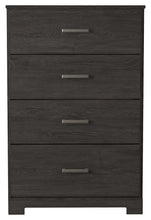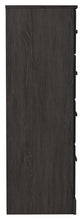 With its clean-lined look and modern attitude, this chest of drawers is a fresh style awakening. Warm charcoal hue over replicated oak grain easily complements other furniture finishes. Smooth drawer fronts with antiqued pewter-tone handles complete the aesthetic.