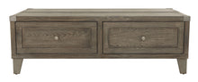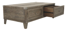 Celebrating the lighter side of modern industrial style, this lift top coffee table is the best in form meets function. The table�s less-is-more weathered finish allows the natural wood grain to take center stage. Metal bracket accents and tapered metal feet in a silvertone finish are a cool yet refined touch. Split top design includes a lift top on one side and fixed surface on the other. Two smooth-gliding drawers offer plenty of handy storage.