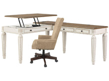 Elevating the art of traditional cottage styling this designer desk is your heavenly home office realized. Antiqued two-tone aesthetic blends a chipped white with a distressed wood tone top for added charm. Framed drawer fronts decorative corbels and elegantly turned and tapered legs add refinement while dark bronze-tone knobs lend a classic touch.