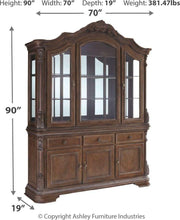 Classic traditional styling with an ornate flavor. Sophisticated dark brown oak finish with a white glazed accent. Tops feature book matched veneer with contrasting Ash swirl inlay border. Cases feature serpentine shaping with thick profiled tops and framed drawer fronts. Ornate round metal knobs finished in an aged bronze color. Shapely table top sits on double pedestal base with cast ornamentation and is designed to seat 6-10. Beautiful ornate chair frame with upholstered seat and back in beige color fabric. The dining room china is lighted.
