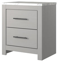 Cool, clean and casually modern. This nightstand�s wispy dove gray finish and faux Calcutta marble top set the tone for your calming sanctuary. Large linear pulls add dimension and authenticity. Two smooth-gliding drawers neatly accommodate your bedside needs.