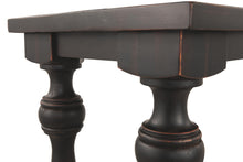 This black sofa table has a dramatic presence�exactly what an eclectically styled room needs. Solid wood planks and thick veneer merge seamlessly together for a hearty helping of style. Handsomely turned legs connect to a lower shelf flush with the floor. A rustic wirebrush technique gives this stunning sofa end table in black with show-through contrasting just enough of a weathered sensibility.
