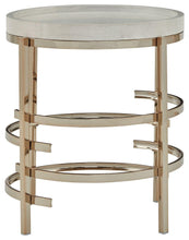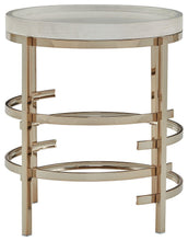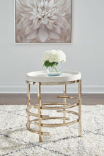 Add a natural spin with a modern vibe to your living space with this end table. Its top captivates with a distressed vintage white finish. Featuring a dynamically layered base in a light goldtone, this table epitomizes contemporary style. With striking character, it's sure to garner attention.