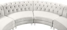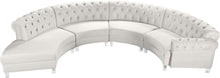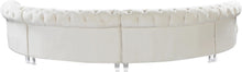 Sit back and relax after a long day at work on this Anabella Cream Velvet 4pc. Sectional from Meridian Furniture. Rich cream velvet upholstery is complemented with deep tufting and chrome nailheads, creating a contemporary piece that's perfect for any room in your living space. Acrylic lucite legs finish off this elegant sectional's design, providing its frame with sturdy support as well as balance for its luxurious cream color.