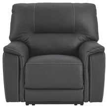 Wowing in a deep and dramatic shade of midnight gray, this power recliner reflects a clean-lined approach whose time has come. Offering the cool look of leather�but with a warm and cozy feel�this ultra-contemporary recliner entices with an Easy View™ power headrest that lets you fully recline and still have a primo view of the TV. Factor in chicly wrapped armrests, jumbo contrast stitching and a one-touch power control with USB plug-in, and you�ve got exceptional form and function from head to toe.