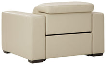Truly putting high design into recline, this recliner in gray with genuine leather seating area proves that just because you�re a recliner doesn�t mean you have to look like one. Deceptively beautiful, its ultra clean-lined aesthetic is as cool and contemporary as they come. The low-profile back has a super swank look. When you need more support for your head and neck, the press of a button engages the Easy View™ power adjustable headrest, designed to let you lean back and still have a primo view of the TV. To save space, the zero wall design requires minimal space between wall and chair back. Indulgent pillow top seating gives an added layer of comfort.