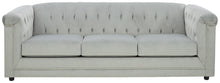 With a timeless classic Chesterfield styling that's very much in vogue, this sofa makes a brilliant statement. Its beautifully neutral silvery gray velvet fabric looks as good as it feels. Nailhead trim, button tufting and high shelter arms give the sofa an effortlessly elegant appeal. The hidden leg design is an on-trend addition for modern spaces.