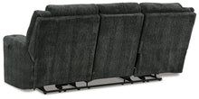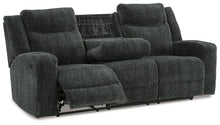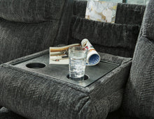 Ideal for those who seek synergy of form and function, this reclining sofa with drop-down table is made for everyday indulgence. Its motion features are decidedly modern; the upholstery velvety soft. A versatile, dark neutral hue takes you back to style basics. Track arms frame the chunky profile, completing this relaxed approach to contemporary decor.