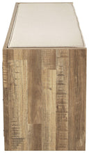 The clean profile of this long storage bench makes an entrance anywhere and everywhere you place it. Replicated butcher-block wood grain adds a fresh flair. Wrapped in beige fabric, the reversible, foam-cushioned seat caters to your comfort. Four open storage compartments add function to form in this must-have piece for large spaces.